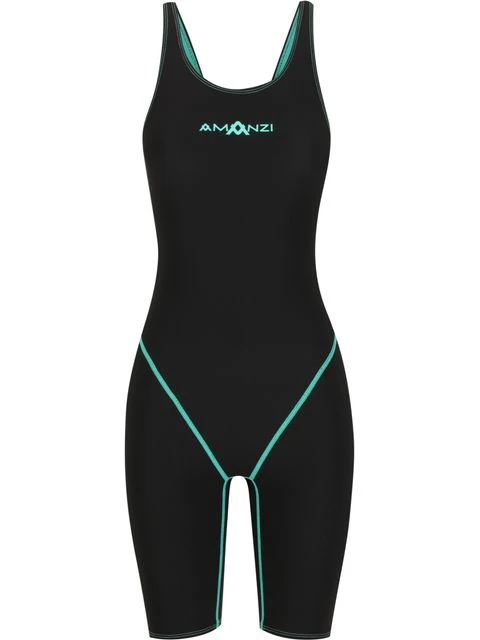 The AMANZI Acceler8 RIZE Racing Kneeskin – Jet/Spearmint is a FINA Approved (now known as World Aquatics) racing swimsuit, tailored to competitive swimmers across all levels.